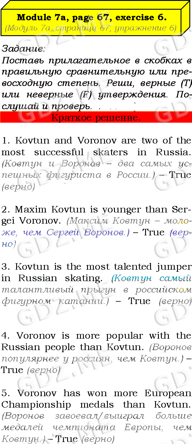 Подробный вариант решения из решебника (ГДЗ): Страница номер 67-7a-6 (Module 6. Having fun. Module 7. In the spotlight. Страница 67) по предмету Английский язык, за 7 класс, авторы учебника Ю.Е. Ваулина, Д. Дули, О.Е. Подолянко, В. Эванс.