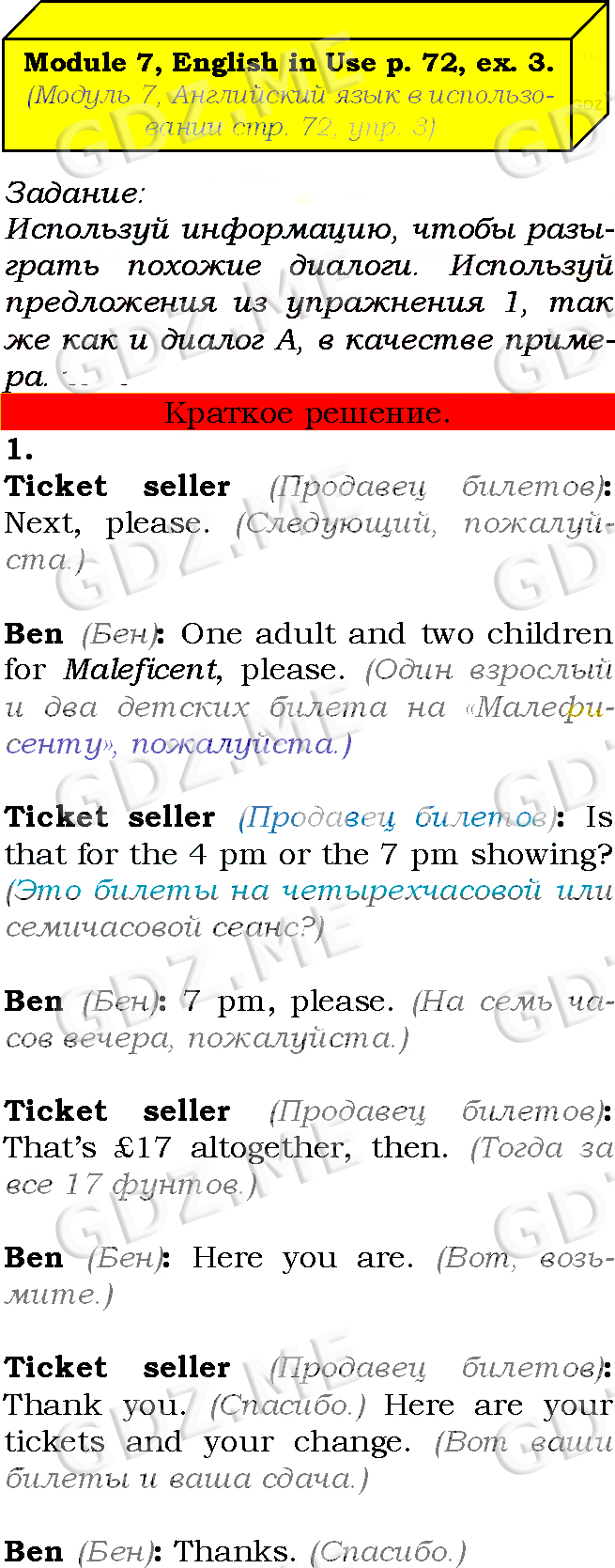 Подробный вариант решения из решебника (ГДЗ): Страница номер 72-7-3 (Module 6. Having fun. Module 7. In the spotlight. Страница 72) по предмету Английский язык, за 7 класс, авторы учебника Ю.Е. Ваулина, Д. Дули, О.Е. Подолянко, В. Эванс.