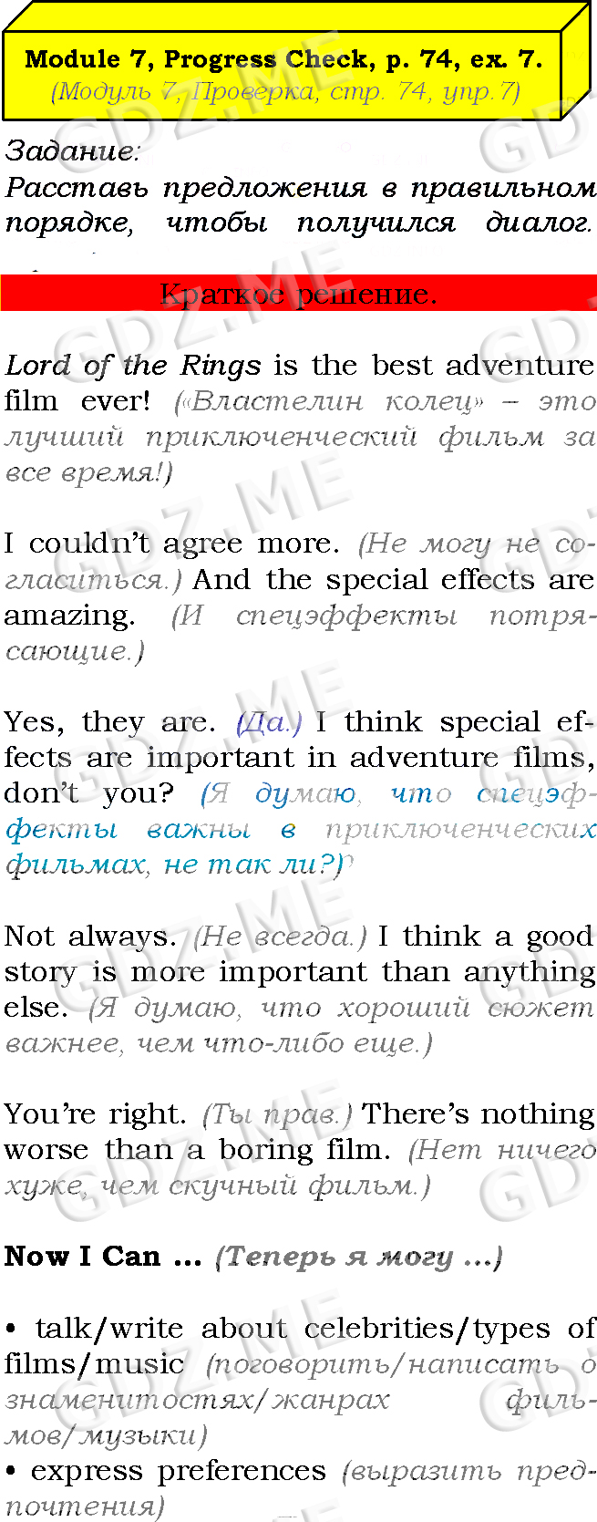 Подробный вариант решения из решебника (ГДЗ): Страница номер 74-7-7 (Module 6. Having fun. Module 7. In the spotlight. Страница 74) по предмету Английский язык, за 7 класс, авторы учебника Ю.Е. Ваулина, Д. Дули, О.Е. Подолянко, В. Эванс.