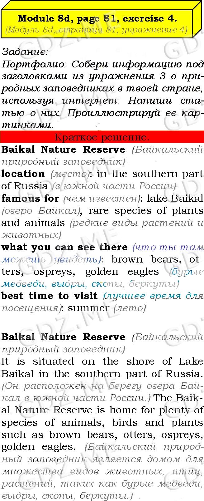 Подробный вариант решения из решебника (ГДЗ): Страница номер 81-8d-4 (Module 7. In the spotlight. Module 8. Green issues. Страница 81) по предмету Английский язык, за 7 класс, авторы учебника Ю.Е. Ваулина, Д. Дули, О.Е. Подолянко, В. Эванс.
