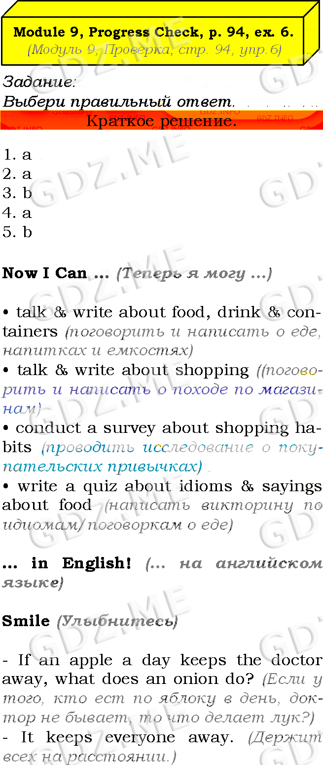 Подробный вариант решения из решебника (ГДЗ): Страница номер 94-9-6 (Module 8. Green issues. Module 9. Shopping time. Страница 94) по предмету Английский язык, за 7 класс, авторы учебника Ю.Е. Ваулина, Д. Дули, О.Е. Подолянко, В. Эванс.