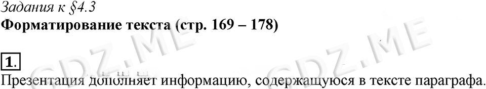 Подробный вариант решения из решебника (ГДЗ): Задание номер 1 (§4.3. Форматирование текста. Cтраницы 169-178) по предмету Информатика, за 7 класс, авторы учебника Босова.