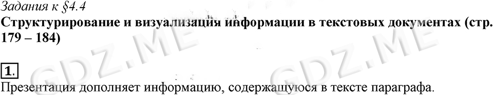 Подробный вариант решения из решебника (ГДЗ): Задание номер 1 (§4.4. Структурирование и визуализация информации в текстовых документах. Cтраницы 179-184) по предмету Информатика, за 7 класс, авторы учебника Босова.