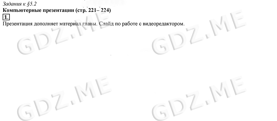 Подробный вариант решения из решебника (ГДЗ): Задание номер 1 (§5.2. Компьютерные презентации. Cтраницы 221-224) по предмету Информатика, за 7 класс, авторы учебника Босова.