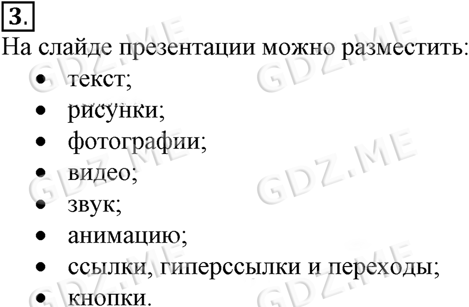 Подробный вариант решения из решебника (ГДЗ): Задание номер 3 (§5.2. Компьютерные презентации. Cтраницы 221-224) по предмету Информатика, за 7 класс, авторы учебника Босова.