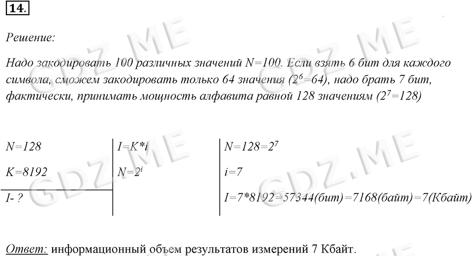Подробный вариант решения из решебника (ГДЗ): Задание номер 14 (§1.6. Измерение информации. Cтраницы 44-52) по предмету Информатика, за 7 класс, авторы учебника Босова.