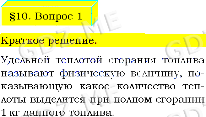 Подробный вариант решения из решебника (ГДЗ): Задание номер 1 (§10. Энергия топлива. Удельная теплота сгорания. Вопросы) по предмету Физика, за 8 класс, авторы учебника Пёрышкин А.В..