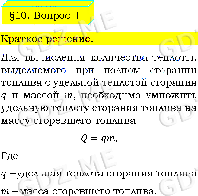 Подробный вариант решения из решебника (ГДЗ): Задание номер 4 (§10. Энергия топлива. Удельная теплота сгорания. Вопросы) по предмету Физика, за 8 класс, авторы учебника Пёрышкин А.В..