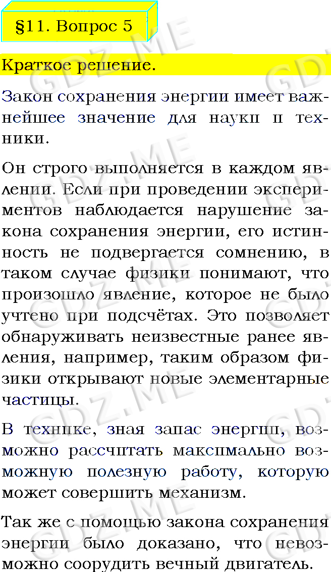 Подробный вариант решения из решебника (ГДЗ): Задание номер 5 (§11. Закон сохранения и превращения энергии в механических и тепловых процессах. Вопросы) по предмету Физика, за 8 класс, авторы учебника Пёрышкин А.В..