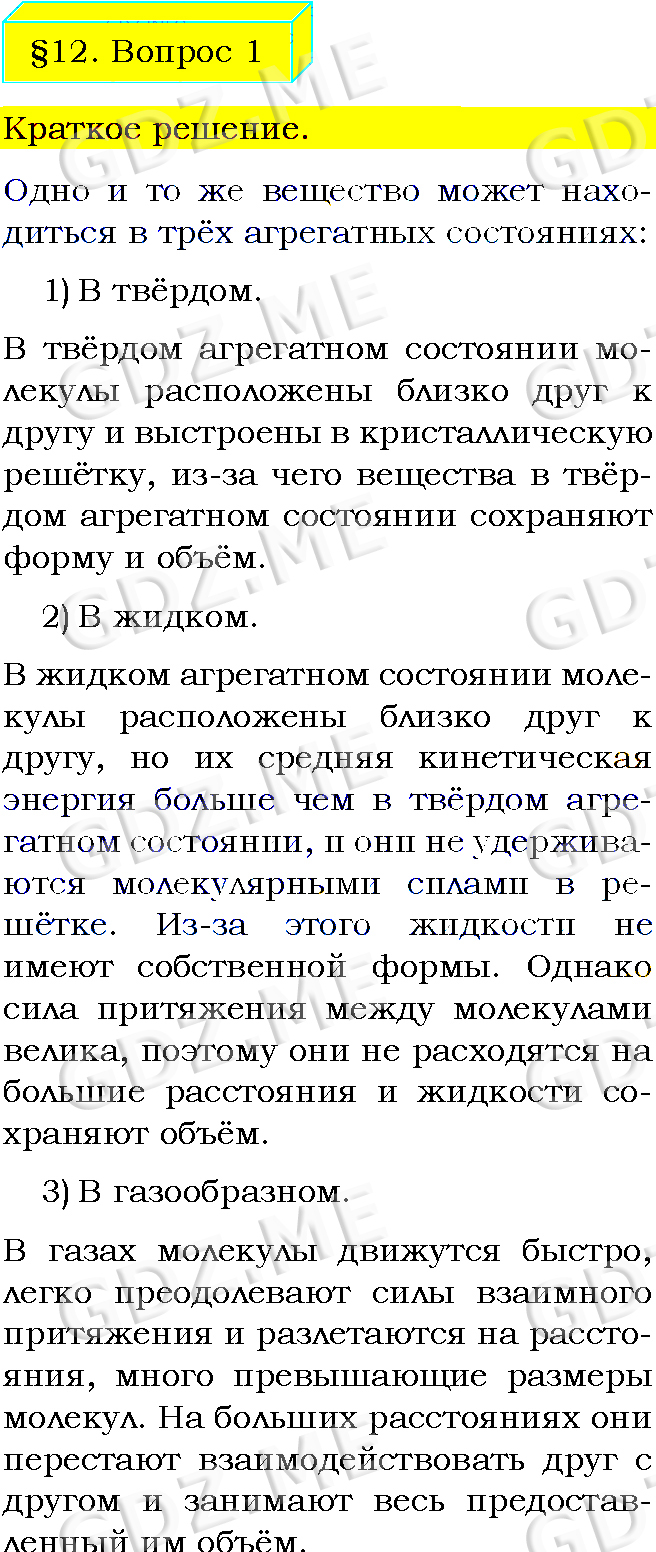 Подробный вариант решения из решебника (ГДЗ): Задание номер 1 (§12. Агрегатные состояния вещества. Вопросы) по предмету Физика, за 8 класс, авторы учебника Пёрышкин А.В..