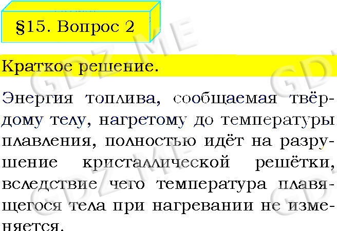 Подробный вариант решения из решебника (ГДЗ): Задание номер 2 (§15. Удельная теплота плавления. Вопросы) по предмету Физика, за 8 класс, авторы учебника Пёрышкин А.В..