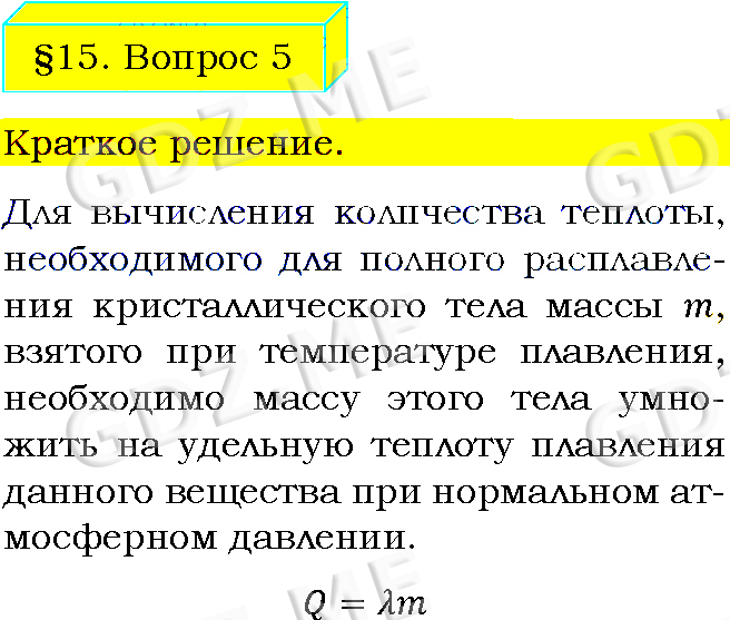 Подробный вариант решения из решебника (ГДЗ): Задание номер 5 (§15. Удельная теплота плавления. Вопросы) по предмету Физика, за 8 класс, авторы учебника Пёрышкин А.В..