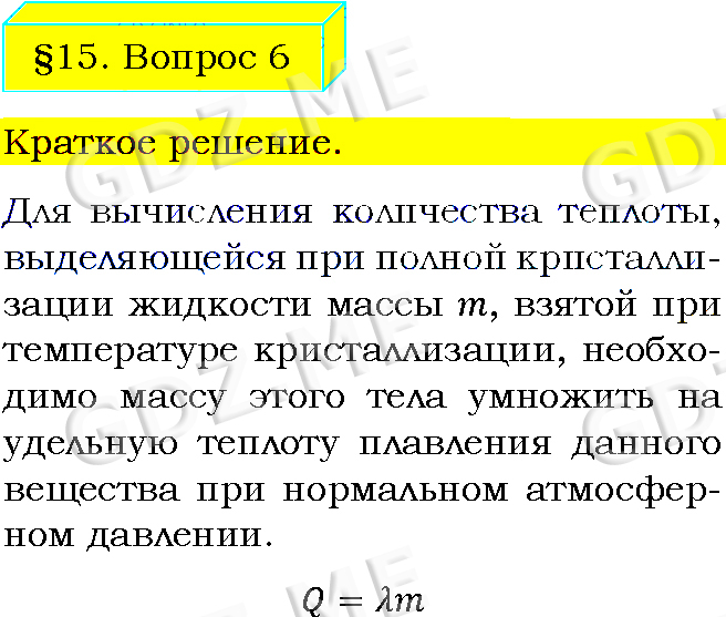 Подробный вариант решения из решебника (ГДЗ): Задание номер 6 (§15. Удельная теплота плавления. Вопросы) по предмету Физика, за 8 класс, авторы учебника Пёрышкин А.В..