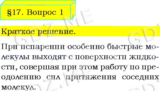 Подробный вариант решения из решебника (ГДЗ): Задание номер 1 (§17. Поглощение энергии при испарении жидкости и выделение её при конденсации пара. Вопросы) по предмету Физика, за 8 класс, авторы учебника Пёрышкин А.В..