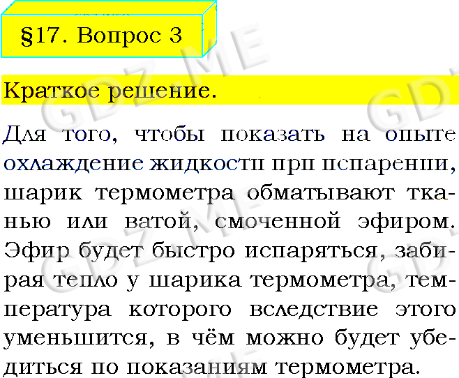 Подробный вариант решения из решебника (ГДЗ): Задание номер 3 (§17. Поглощение энергии при испарении жидкости и выделение её при конденсации пара. Вопросы) по предмету Физика, за 8 класс, авторы учебника Пёрышкин А.В..