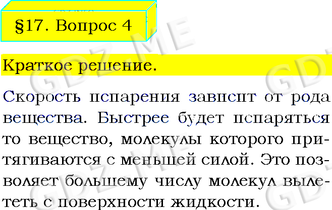 Подробный вариант решения из решебника (ГДЗ): Задание номер 4 (§17. Поглощение энергии при испарении жидкости и выделение её при конденсации пара. Вопросы) по предмету Физика, за 8 класс, авторы учебника Пёрышкин А.В..