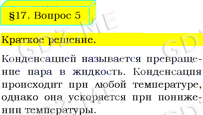 Подробный вариант решения из решебника (ГДЗ): Задание номер 5 (§17. Поглощение энергии при испарении жидкости и выделение её при конденсации пара. Вопросы) по предмету Физика, за 8 класс, авторы учебника Пёрышкин А.В..