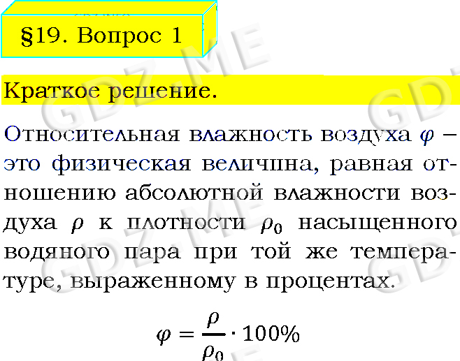 Подробный вариант решения из решебника (ГДЗ): Задание номер 1 (§19. Влажность воздуха. Способы определения влажности воздуха. Вопросы) по предмету Физика, за 8 класс, авторы учебника Пёрышкин А.В..