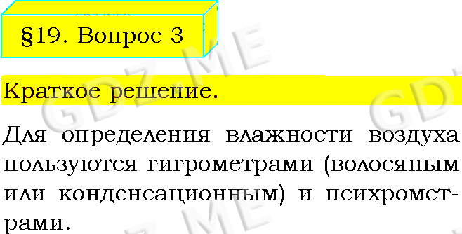 Подробный вариант решения из решебника (ГДЗ): Задание номер 3 (§19. Влажность воздуха. Способы определения влажности воздуха. Вопросы) по предмету Физика, за 8 класс, авторы учебника Пёрышкин А.В..