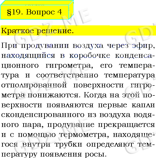 Подробный вариант решения из решебника (ГДЗ): Задание номер 4 (§19. Влажность воздуха. Способы определения влажности воздуха. Вопросы) по предмету Физика, за 8 класс, авторы учебника Пёрышкин А.В..