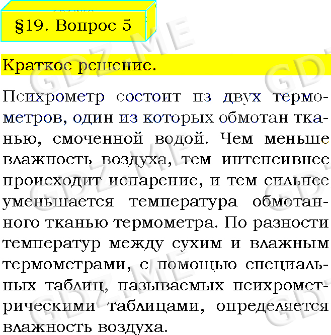 Подробный вариант решения из решебника (ГДЗ): Задание номер 5 (§19. Влажность воздуха. Способы определения влажности воздуха. Вопросы) по предмету Физика, за 8 класс, авторы учебника Пёрышкин А.В..