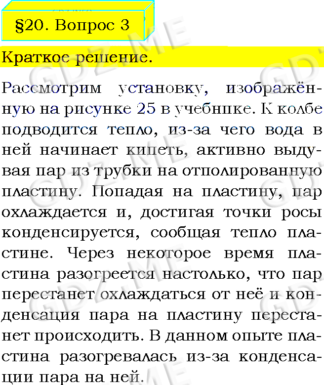 Подробный вариант решения из решебника (ГДЗ): Задание номер 3 (§20. Удельная теплота парообразования и конденсации. Вопросы) по предмету Физика, за 8 класс, авторы учебника Пёрышкин А.В..