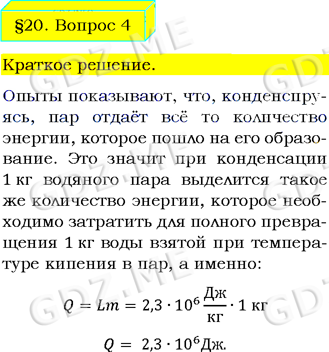 Подробный вариант решения из решебника (ГДЗ): Задание номер 4 (§20. Удельная теплота парообразования и конденсации. Вопросы) по предмету Физика, за 8 класс, авторы учебника Пёрышкин А.В..