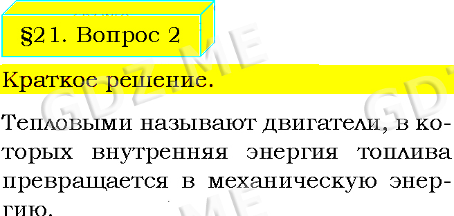 Подробный вариант решения из решебника (ГДЗ): Задание номер 2 (§21. Работа газа и пара при расширении. Вопросы) по предмету Физика, за 8 класс, авторы учебника Пёрышкин А.В..