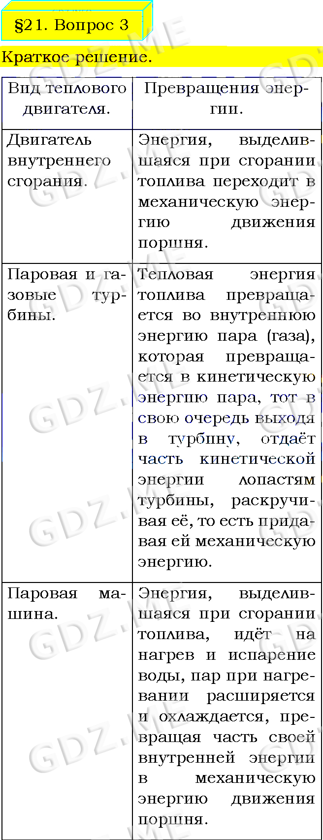 Подробный вариант решения из решебника (ГДЗ): Задание номер 3 (§21. Работа газа и пара при расширении. Вопросы) по предмету Физика, за 8 класс, авторы учебника Пёрышкин А.В..