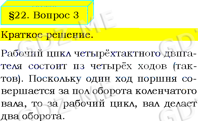 Подробный вариант решения из решебника (ГДЗ): Задание номер 3 (§22. Двигатель внутреннего сгорания. Вопросы) по предмету Физика, за 8 класс, авторы учебника Пёрышкин А.В..