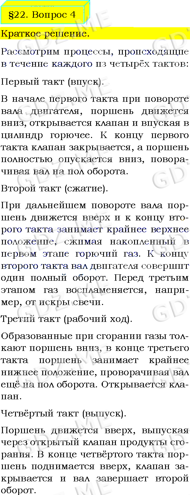 Подробный вариант решения из решебника (ГДЗ): Задание номер 4 (§22. Двигатель внутреннего сгорания. Вопросы) по предмету Физика, за 8 класс, авторы учебника Пёрышкин А.В..