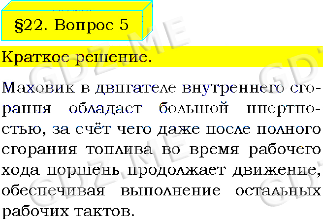 Подробный вариант решения из решебника (ГДЗ): Задание номер 5 (§22. Двигатель внутреннего сгорания. Вопросы) по предмету Физика, за 8 класс, авторы учебника Пёрышкин А.В..
