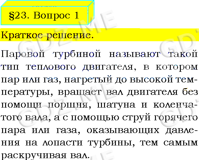 Подробный вариант решения из решебника (ГДЗ): Задание номер 1 (§23. Паровая турбина. Вопросы) по предмету Физика, за 8 класс, авторы учебника Пёрышкин А.В..