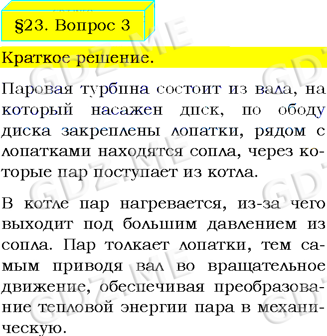 Подробный вариант решения из решебника (ГДЗ): Задание номер 3 (§23. Паровая турбина. Вопросы) по предмету Физика, за 8 класс, авторы учебника Пёрышкин А.В..