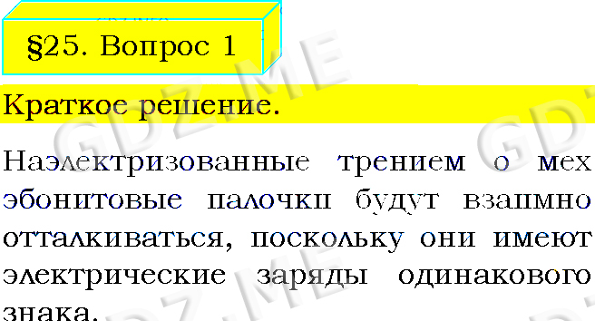 Подробный вариант решения из решебника (ГДЗ): Задание номер 1 (§25. Электризация тел при соприкосновении. Взаимодействие заряженных тел. Вопросы) по предмету Физика, за 8 класс, авторы учебника Пёрышкин А.В..