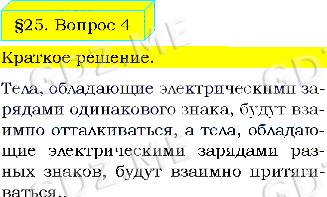 Подробный вариант решения из решебника (ГДЗ): Задание номер 4 (§25. Электризация тел при соприкосновении. Взаимодействие заряженных тел. Вопросы) по предмету Физика, за 8 класс, авторы учебника Пёрышкин А.В..
