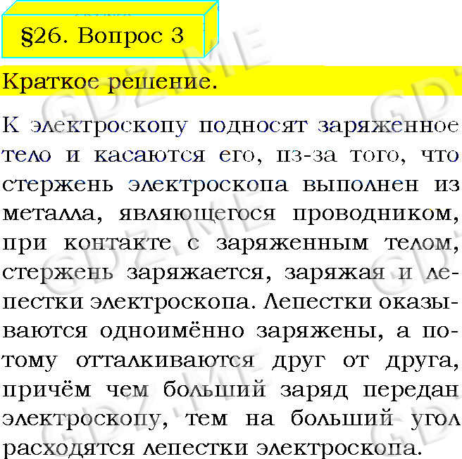 Подробный вариант решения из решебника (ГДЗ): Задание номер 3 (§26. Электроскоп. Вопросы) по предмету Физика, за 8 класс, авторы учебника Пёрышкин А.В..