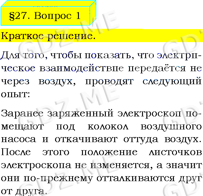 Подробный вариант решения из решебника (ГДЗ): Задание номер 1 (§27. Электрическое поле. Вопросы) по предмету Физика, за 8 класс, авторы учебника Пёрышкин А.В..