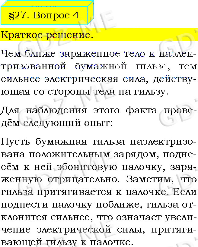 Подробный вариант решения из решебника (ГДЗ): Задание номер 4 (§27. Электрическое поле. Вопросы) по предмету Физика, за 8 класс, авторы учебника Пёрышкин А.В..