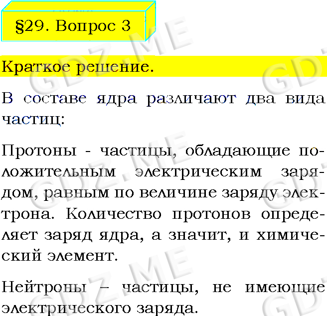 Подробный вариант решения из решебника (ГДЗ): Задание номер 3 (§29. Строение атомов. Вопросы) по предмету Физика, за 8 класс, авторы учебника Пёрышкин А.В..