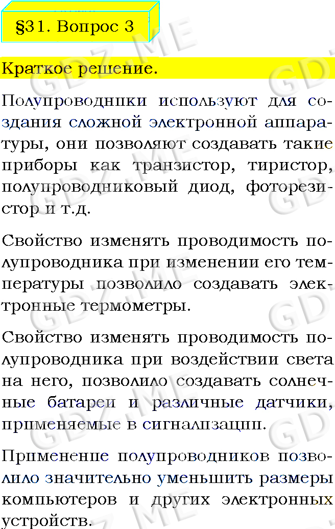 Подробный вариант решения из решебника (ГДЗ): Задание номер 3 (§31. Проводники, полупроводники и непроводники электричества. Вопросы) по предмету Физика, за 8 класс, авторы учебника Пёрышкин А.В..