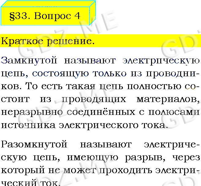 Подробный вариант решения из решебника (ГДЗ): Задание номер 4 (§33. Электрическая цепь и её составные части. Вопросы) по предмету Физика, за 8 класс, авторы учебника Пёрышкин А.В..