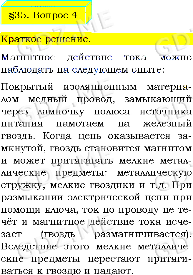 Подробный вариант решения из решебника (ГДЗ): Задание номер 4 (§35. Действия электрического тока. Вопросы) по предмету Физика, за 8 класс, авторы учебника Пёрышкин А.В..