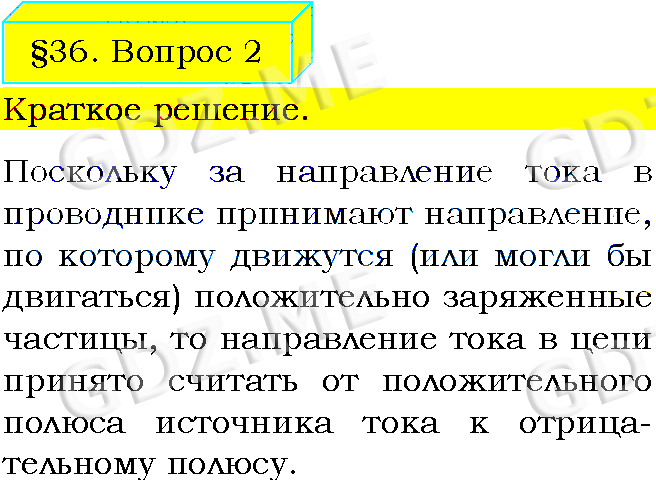 Подробный вариант решения из решебника (ГДЗ): Задание номер 2 (§36. Направление электрического тока. Вопросы) по предмету Физика, за 8 класс, авторы учебника Пёрышкин А.В..