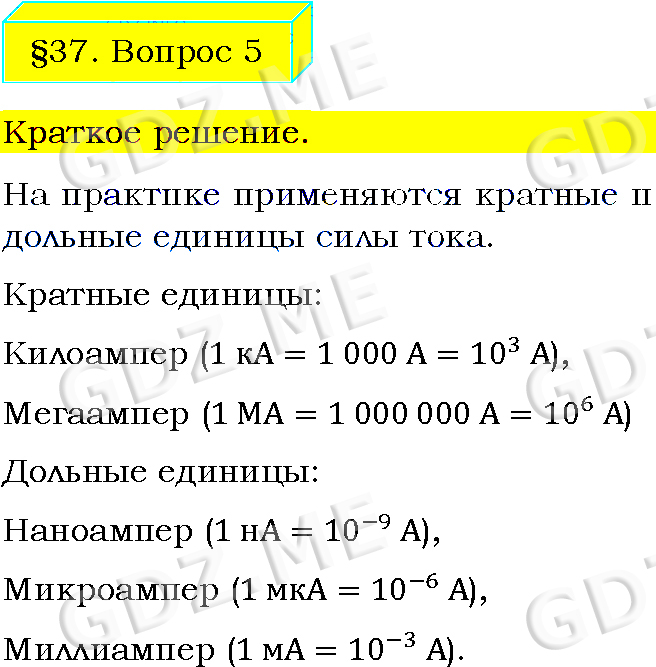 Подробный вариант решения из решебника (ГДЗ): Задание номер 5 (§37. Сила тока. Единицы силы тока. Вопросы) по предмету Физика, за 8 класс, авторы учебника Пёрышкин А.В..