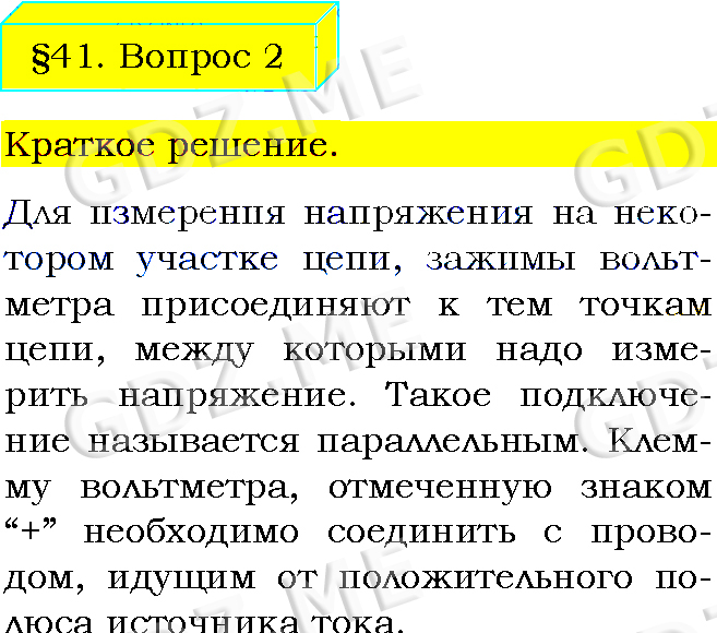 Подробный вариант решения из решебника (ГДЗ): Задание номер 2 (§41. Вольтметр. Измерение напряжения. Вопросы) по предмету Физика, за 8 класс, авторы учебника Пёрышкин А.В..