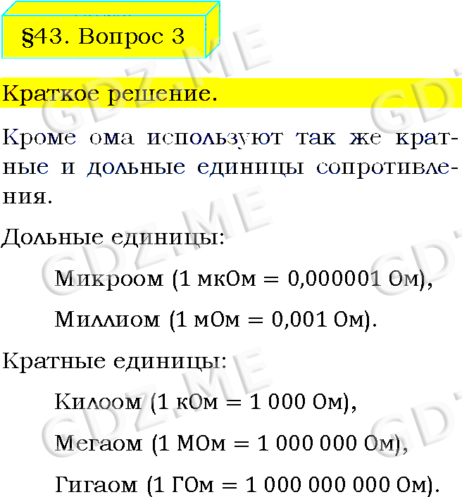 Подробный вариант решения из решебника (ГДЗ): Задание номер 3 (§43. Электрическое сопротивление проводников. Единицы сопротивления. Вопросы) по предмету Физика, за 8 класс, авторы учебника Пёрышкин А.В..