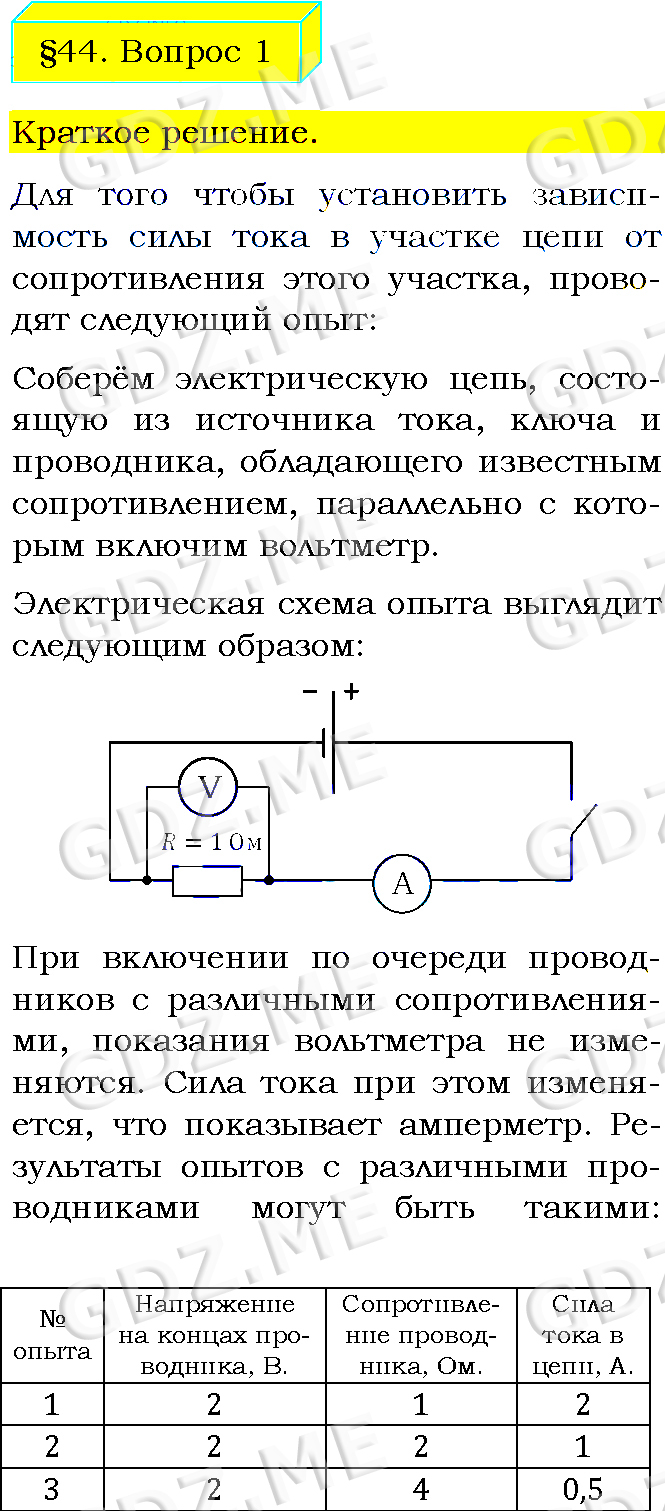 Подробный вариант решения из решебника (ГДЗ): Задание номер 1 (§44. Закон Ома для участка цепи. Вопросы) по предмету Физика, за 8 класс, авторы учебника Пёрышкин А.В..