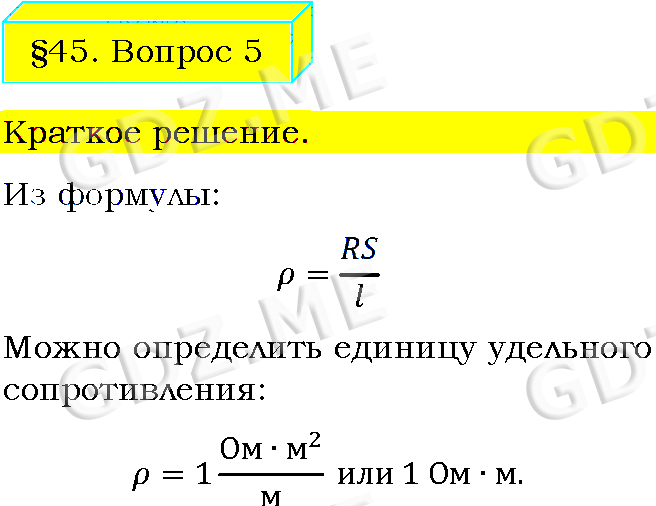 Подробный вариант решения из решебника (ГДЗ): Задание номер 5 (§45. Расчёт сопротивления проводника. Удельное сопротивление. Вопросы) по предмету Физика, за 8 класс, авторы учебника Пёрышкин А.В..