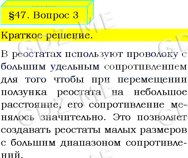 Подробный вариант решения из решебника (ГДЗ): Задание номер 3 (§47. Реостат. Вопросы) по предмету Физика, за 8 класс, авторы учебника Пёрышкин А.В..